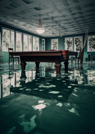 A close interior shot showcases a pristine pool table with a blue eight ball, and well-crafted wooden cue stick. The dim lighting adds to the mood.