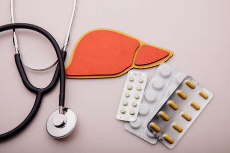 Human organ liver model and stethoscope, top view. Human health and medical concept.