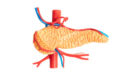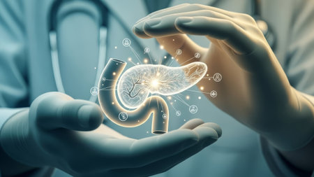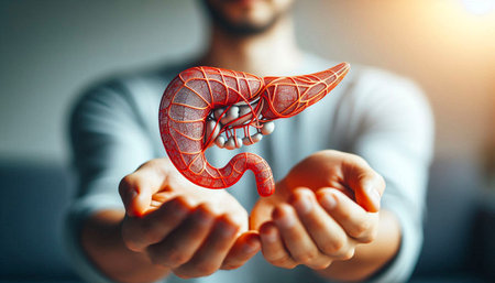 A detailed 3D-rendered pancreas held in hands, symbolizing digestive health, endocrinology, diabetes awareness, organ function, and medical research