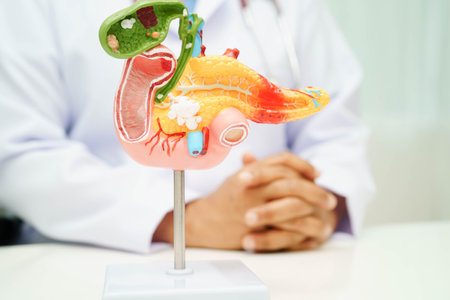 Doctor reviewing a colorful anatomical model of the pancreas with medication on a table in a clinic