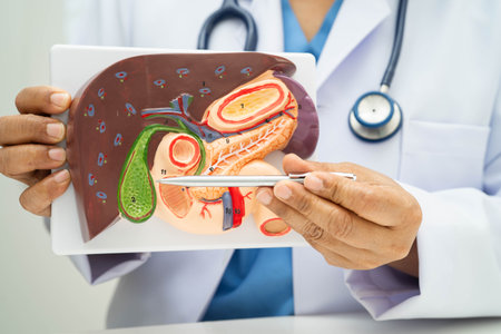 A doctor in a white coat holds a model of a liver and pancreas in their hand, with a pen in the other hand. A stethoscope hangs around their neck.