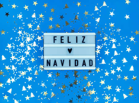Light box with Feliz Navidad phrase, Spanish Merry Christmas on blue background with confetti.