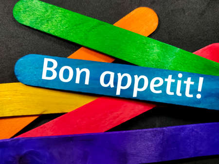 Text Bon appetit! with colorful wooden stick on black background.