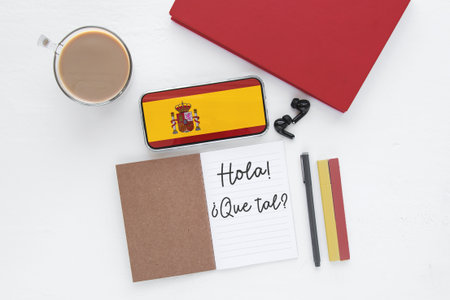 Workspace for learning Spanish. notebook with the phrase Hello how are you in spanish a smartphone with the flag of Spain, a cup of coffee, pens, and earphones. Symbol of language learning and culture