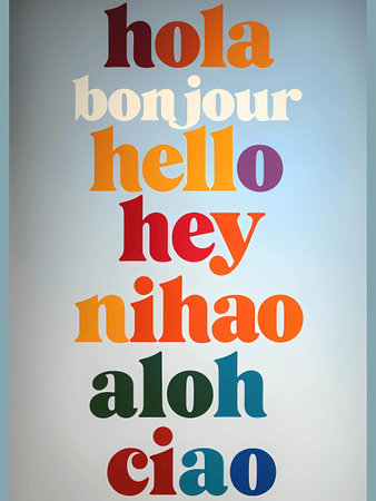 International communication in a diverse world. Group of people speaking different languages, engaging in conversation. Hi in French, Spanish, Chinese, German