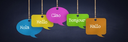 Digital composite of Different Languages text on hanging paper speech bubbles