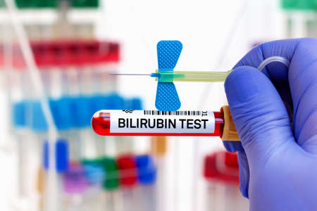 Blood sample of patient for bilirubin test in laboratory. Doctor with Blood tube and needle for Bilirubin test