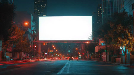 A captivating urban night scene showcasing empty billboards illuminated amidst towering skyscrapers, highlighting the modern architecture and lively atmosphere of the city.