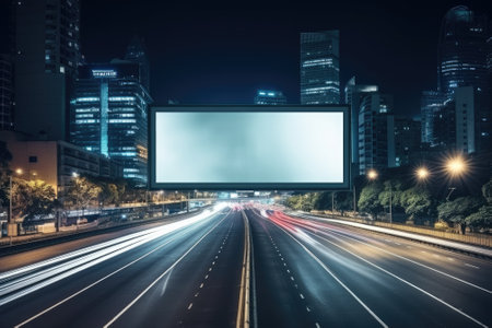 An illuminated blank billboard stands in an urban environment at night. The image shows blurred car lights creating motion trails, with a dark sky and illuminated buildings in the background. This visual could be used for advertising, marketing campaigns, or conceptual designs. The photograph captures a sense of urban energy and modern communication.