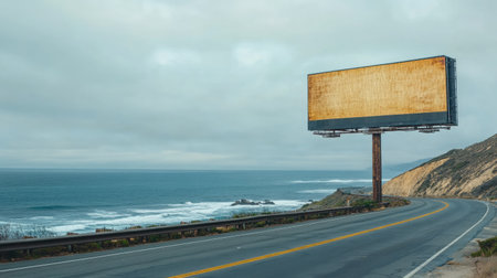 A scenic view of an empty billboard along a tranquil ocean roadside, showcasing the beauty of nature and the coastline under a cloudy sky.