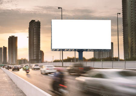 Blank white road billboard with Bangkok cityscape background at sunset. Street advertising poster, mock up, 3D rendering. Front view. The concept of marketing communication to promote or sell idea.