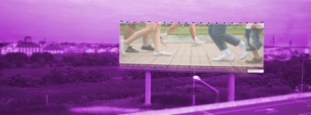 the billboard and road outdoor. road billboard, against the background of green trees of the road, an empty ad-free billboard along the road. Advertising, signboard, blank, pattern, copy space
