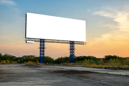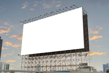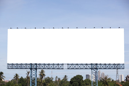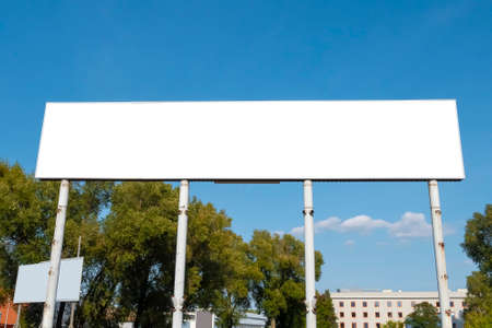 A white colored blank billboard outdoors, outdoor advertising, public information board on land with blue sky