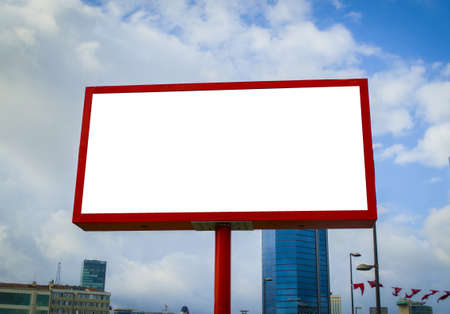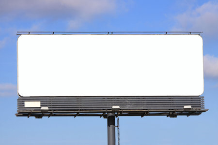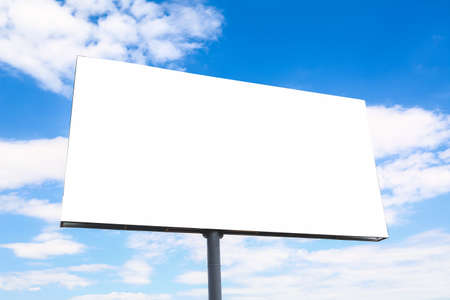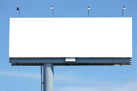 A large blank billboard against a blue sky. A blank canvas waiting for its next message. A wide shot of an empty billboard in an outdoor setting, against a blue sky with some clouds. Clipping path.