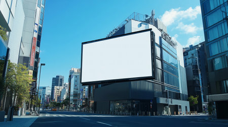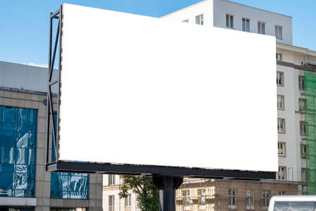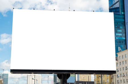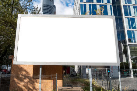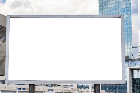 Blank white advertising billboard in front of modern buildings with glass facade in the downtown
