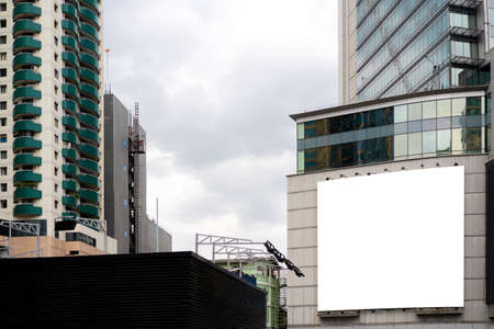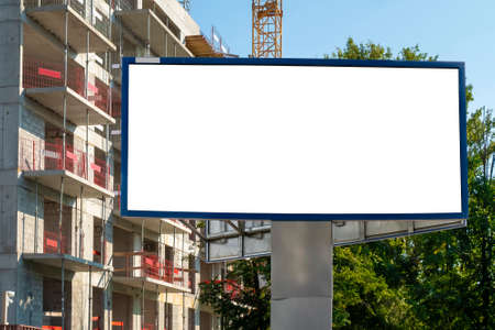 Blank white billboard for advertisement in front of the construction site next to modern residential building