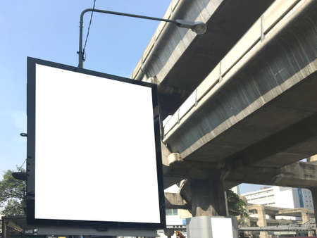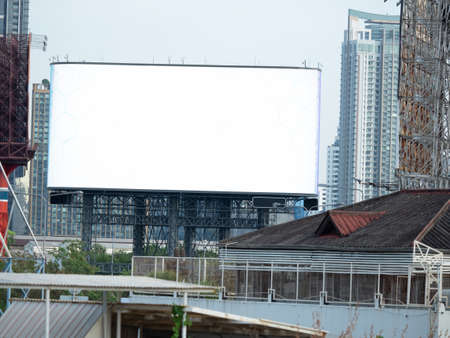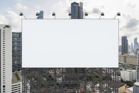 Blank white road billboard with Bangkok cityscape background at day time. Street advertising poster, mock up, 3D rendering. Front view. The concept of marketing communication to promote or sell idea.