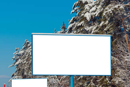 Billboard along the road and highway on a winter snow day. Background for design and advertising.