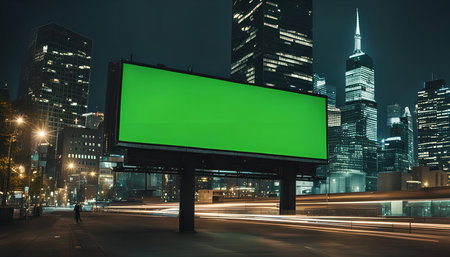 A green screen billboard stands tall in a bustling cityscape, illuminated against the backdrop of towering skyscrapers under the night sky. The city's lights and traffic create a vibrant atmosphere, while the blank billboard invites viewers to imagine their own message or advertisement in this prime location.