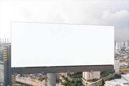 Blank white road billboard with KL cityscape background at day time. Street advertising poster, mock up, 3D rendering. Front view. The concept of marketing communication to promote or sell idea.