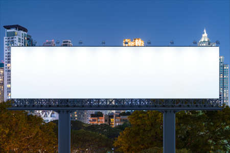 Blank white road billboard with Bangkok cityscape background at night time. Street advertising poster, mock up, 3D rendering. Front view. The concept of marketing communication to promote idea.