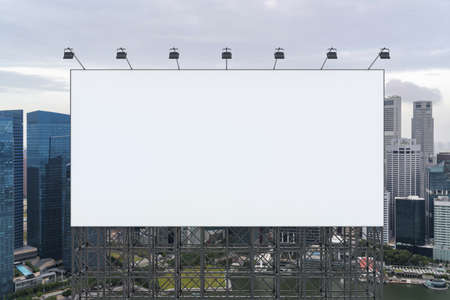 Blank white road billboard with Singapore cityscape background at day time. Street advertising poster, mock up, 3D rendering. Front view. The concept of marketing communication to promote.