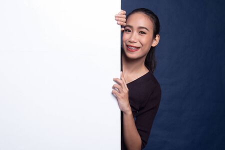 Young Asian woman with blank sign on blue background