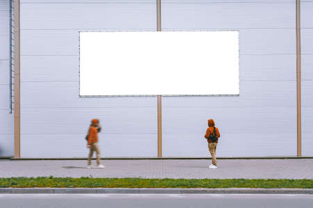 A group of people walk past a large white billboard, copy space for advertising