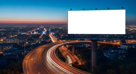 An empty advertising billboard glows against the twilight sky, overlooking a bustling city freeway where long-exposure photography captures vibrant streaks of car lights.