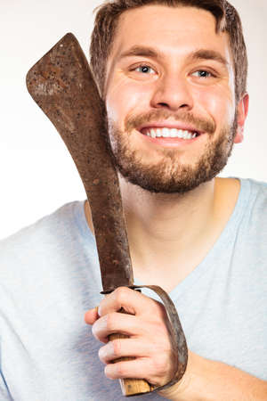 Young man with shaving having fun with machete large knife. Handsome guy removing face beard hair. Skin care and hygiene humor.