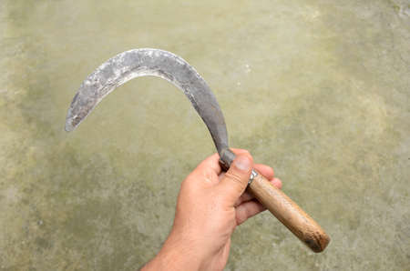 The old sickle and hand of man and in a rice field. Harvesting, respecting traditions. Close up.
