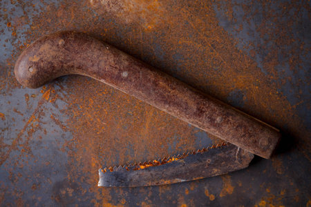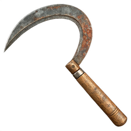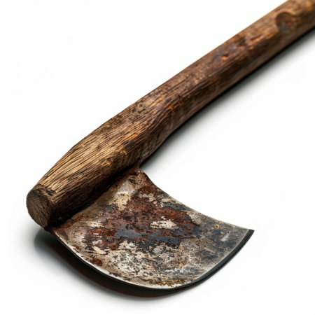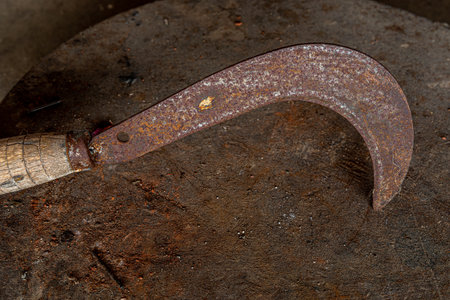 Close up of a rusty scythe forgotten in a withered field under a stormy sky secrets untold