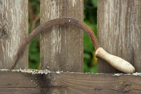 An old rusty sickle hangs on a nail driven into a wooden wall, taken in close-up.