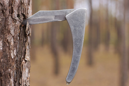 one white iron folding knife sticks out in the gray bark of a pine tree outdoors in nature