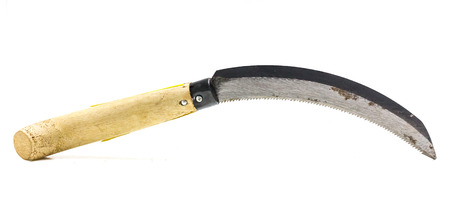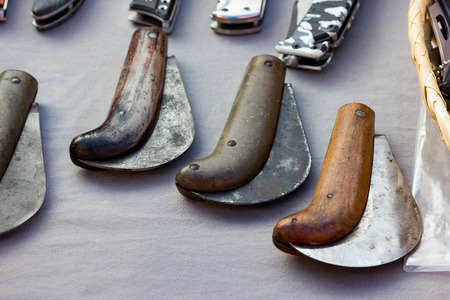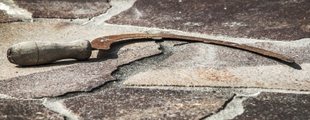closeup the old paddy cutting curves with handle hold hand over out of focus brown background.