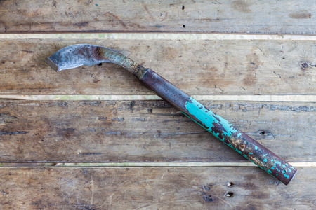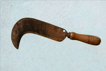 An old sickle on a wooden rustic plank gray background. Top view. Background