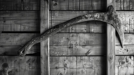 A handcrafted scythe its blade worn and dented hangs on a wall in the farmers shed. Black and white art.