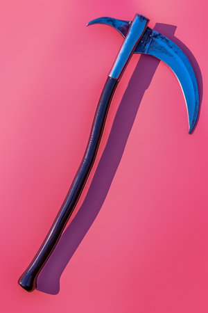 Blue Steel Climbing Ice Axe on Vibrant Pink Background Mountaineering Equipment Concept AI Generative