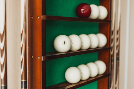 Balls for pool billiards on the shelf. Balls for Russian billiards.