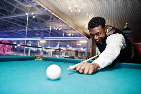 Young handsome african man wearing white shirt, black vest and bow tie play pool billiard.