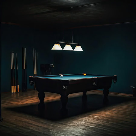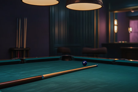 A close interior shot showcases a pristine pool table with a blue eight ball, and well-crafted wooden cue stick. The dim lighting adds to the mood.