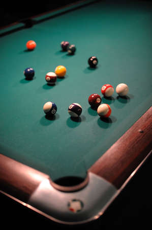 Sport billiard balls on green billiard table in pub. On going billiard game. Competitive players trying to find out the winner of the round. .