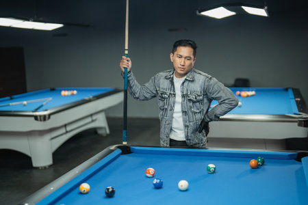 young pro billiard player finding best solution and right angle at billard or snooker pool sport game