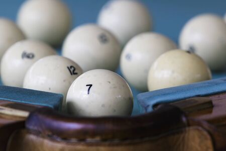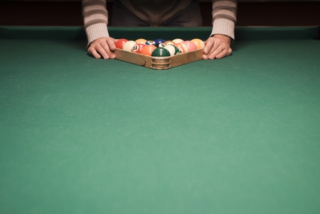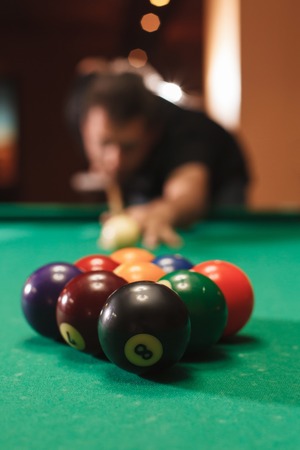 American billiard poule. Triangle of billiard balls. A man getting ready to start a game of billiards.