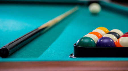 Billiard table with green surface and balls in the billiard club.Pool Game.
