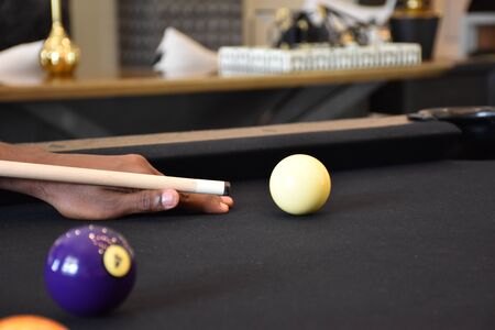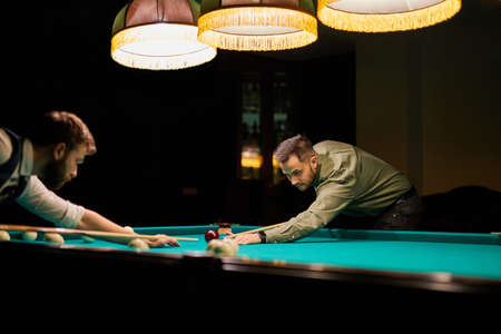 Player has prepared to hit the balls in pool. Nightlife. Pool room on the background.