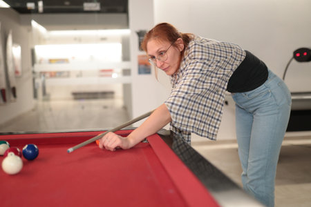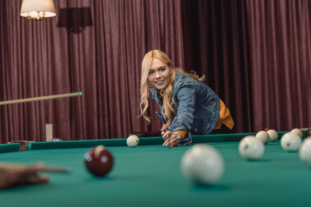 The girl puts out billiard balls to start the game in the billiard club .Playing pool