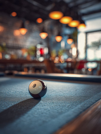 A lone monochrome nine ball rests on a vibrant blue table, illuminated by gentle ambient lighting in a snug game room with inviting warm glow from hanging lamps.