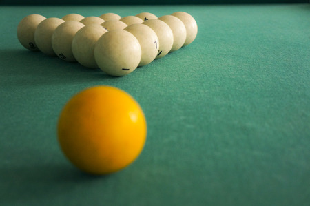 Sports play, recreation, hobby, tactics, billiard table with triangle-shaped balls, white ball at the top of the table, billiards ply