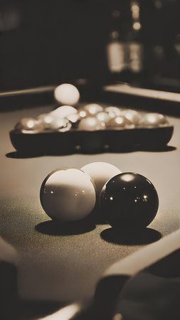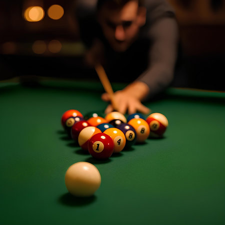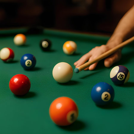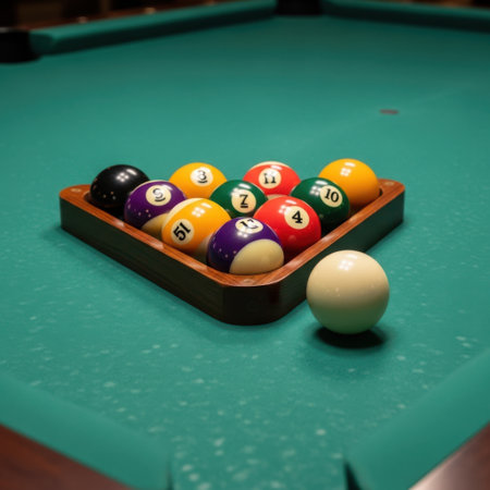 Vibrant billiard balls artistically arranged on a classic pool table for sports and leisure themes